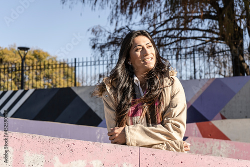 Beautiful Latin woman with a happy smile leaning on a concrete railing.