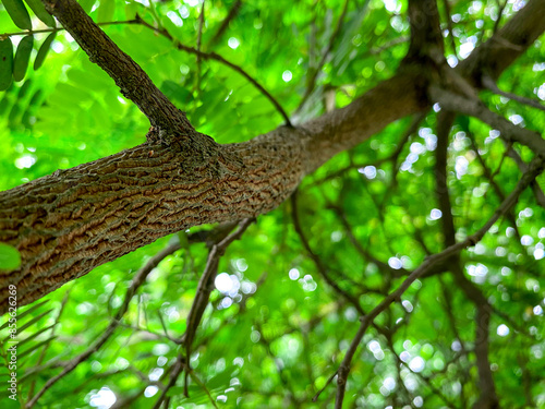 Beautiful leaves and yellow flowers of tamarind tree in the garden.