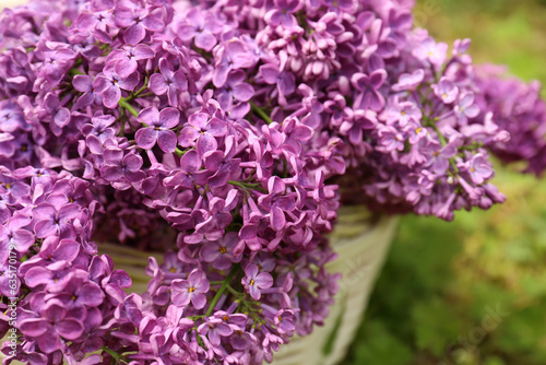 Beautiful lilac flowers in wicker basket outdoors, closeup