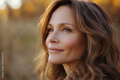 woman, portrait, female, face, beauty, mature, outdoors, sunlight, natural, smile, model, attractive, happy, skin, lifestyle, autumn, fashion, person, elegant, adult, serene, graceful, brunette, eye, nature, warm