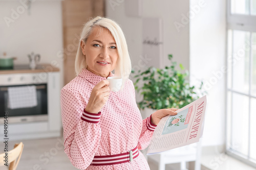 Beautiful mature woman with cup of coffee reading newspaper at home
