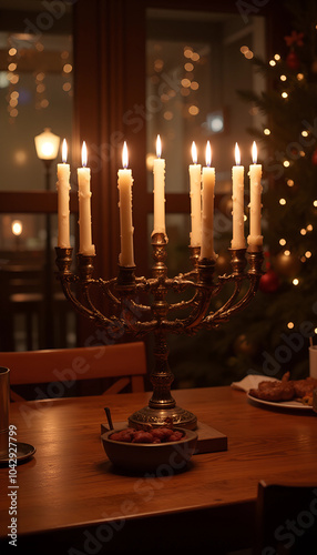 menorah, candle, lit, festive, dining table, holiday, celebration, atmosphere, tradition, decor, warmth, family, gathering, light, interior, setting, decoration, winter, spirituality, joy, togetherness, design, cosy, home, evening, festivity, illumination, cultural, heritage, ambience, meaningful, table setting, religious, ritual, oneness, event, cheerful, delight, artistry, environment, nostalgia