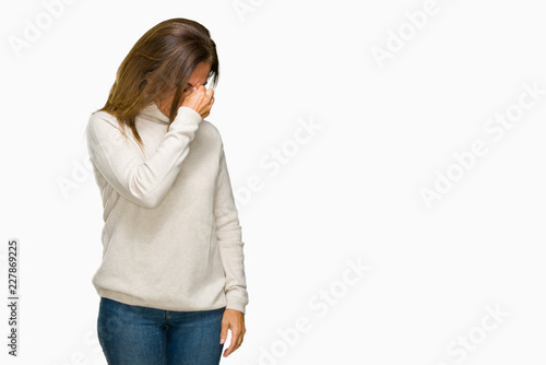 Beautiful middle age adult woman wearing winter sweater over isolated background tired rubbing nose and eyes feeling fatigue and headache. Stress and frustration concept.