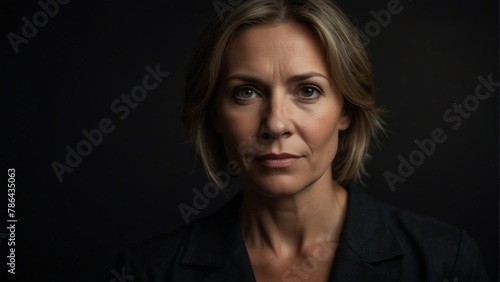 beautiful middle aged woman looking at camera serious on dark plain black background from Generative AI