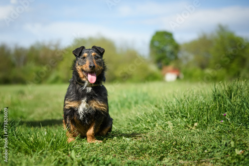 Beautiful mixed breed one eye dog sitting on the meadow during photographing in purpose of adoption