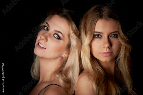 beautiful mother and daughter portrait in Studio on black background. Look great. Professional makeup