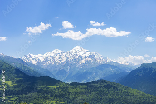 Beautiful mountains landscape on sunny clear summer day. Georgian nature. Hills and mountain snowy peak. Caucasus Svaneti rocky mounts.