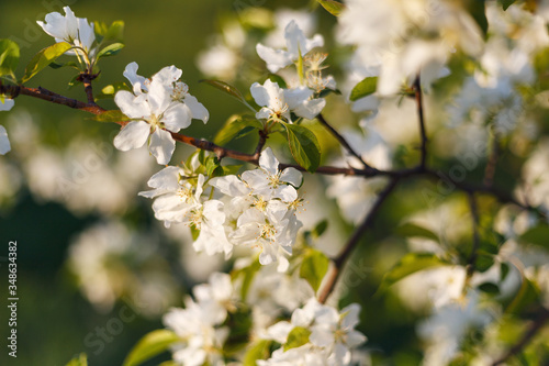 Beautiful natural background. Summer, spring concepts. Fresh cherry flowers in the gentle rays of the warm sun. Copy space. Template for design. Soft focus