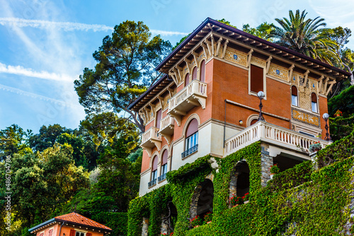 beautiful old stone wall with arches and flowers on old european street, coast, Italy
