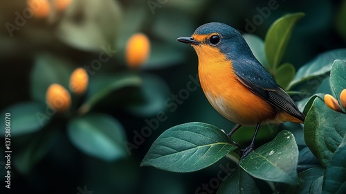 Beautiful Orange Blue Bird Perched on Lush Green Leaves Vibrant Tropical Nature Wildlife Photography Stunning Bird Image Exotic Bird Species Colorful Feathers Detailed Bird Portrait Natural Habitat
