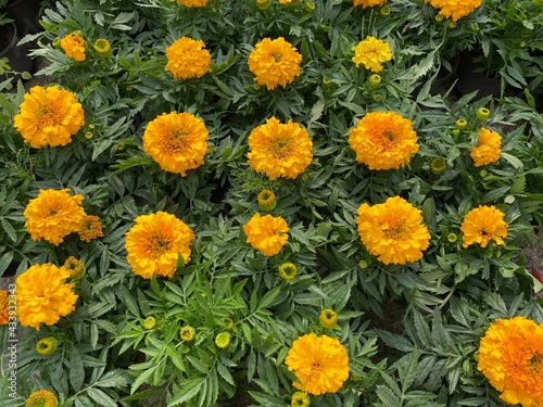 Beautiful orange Marigold flowers, amazing spring flowers of marigold bush, spring flora and flora at plantation.