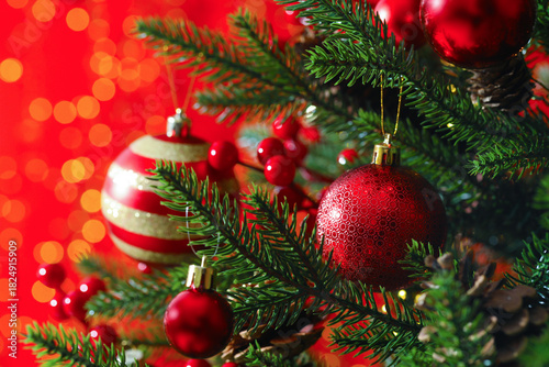 Beautiful ornaments on Christmas tree against red background with blurred lights, closeup. Bokeh effect