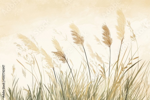 grass, reed, stem, wind, nature, field, meadow, tall, plant, beige, brown, sky, airy, background, watercolor, artistic, tranquil, calm, serene, gold, light, texture, delicate, subtile, movement, blowing, swaying, soft, abstract, illustration, artwork, design, scenic, decorative, warm, natural, autumn, pattern, neutral, organic, simple, graphic, aesthetic