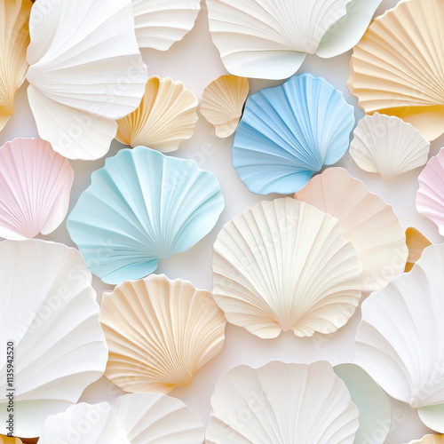 Beautiful paper shells in pastel colors create seamless pattern, showcasing delicate textures and soft hues. This design adds touch of elegance and whimsy to any project