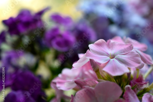 Beautiful Phlox paniculata flowers are blue and pink close-up. Macrophoto of phlox in summer.