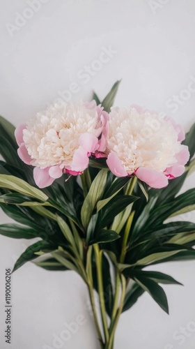 Beautiful Pink and White Peonies with Lush Green Leaves on White Background