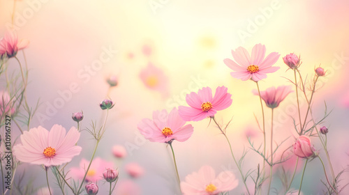 Beautiful pink cosmos flowers in soft pastel sunset light