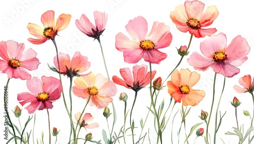 Beautiful pink cosmos flowers with a watercolor painting effect on a white background,