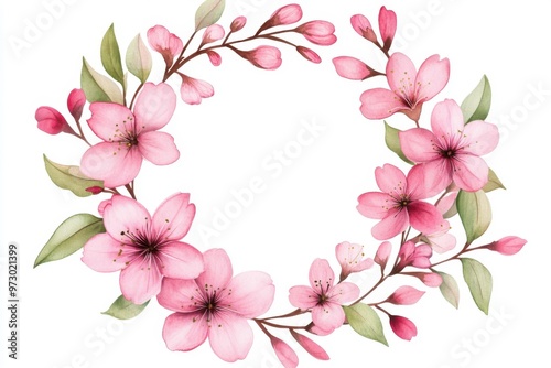 Beautiful pink flower wreath with delicate petals and green leaves, perfect for spring decorations and floral designs.