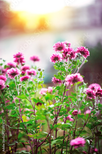 beautiful pink lilac flowers in city flowerbed at sunset. Vintage outdoor autumn photo with warm colors. Macrophotography