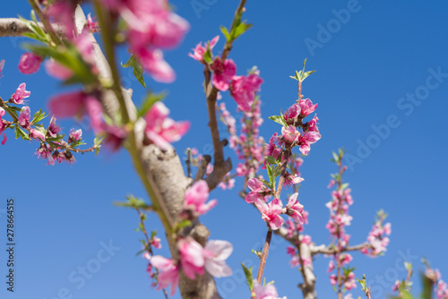 Beautiful pink peach flowers petals and trees blooming on a spring sunny day
