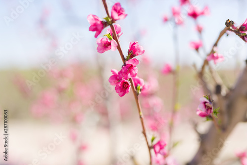 Beautiful pink peach flowers petals and trees blooming on a spring sunny day