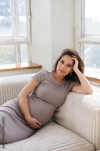 Beautiful pregnant woman in beige dress barefoot. Big pregnant belly. Pretty brunette woman waiting child. Lady in her bedroom lay on sofa near windows