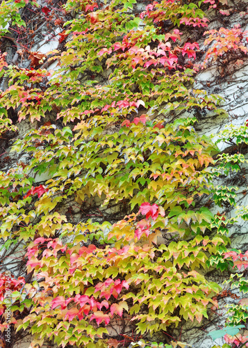 Beautiful red and green leaf of ivy is claiming up the wall. Wall is hidden under the ivy. Thick shroud of ivy. Wall is ivy-encircled.