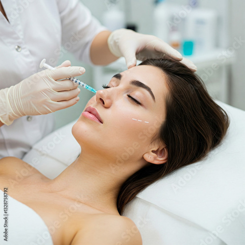 Beautiful relaxed woman at beautician cabinet receiving anti wrinkle injections on cheekbones.