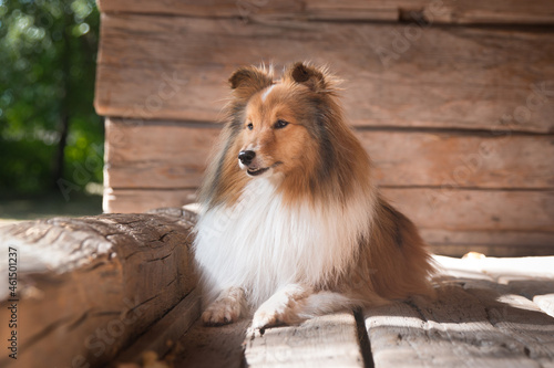 Beautiful sable white sheltie lies outdoors on the sun with background of historical wooden house. Shetland sheepdog, lassie, little collie lies outside on sunny summer day