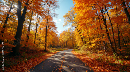 Beautiful scenic autumn forest landscape with a winding road covered in colorful fallen leaves.