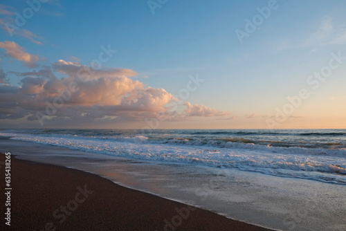 Beautiful seascape of sun setting over the sea with light waves and cloudy sky lit by sunset light. Ocean view with horizon, background with a lot of copy space for text.