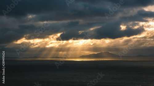 Beautiful seascape splitting rays cloudy clouds sun light sunset Scotland Neist Point