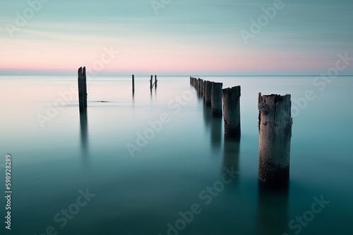 Beautiful seascape with wooden breakwaters at sunset. Long exposure, generative Ai