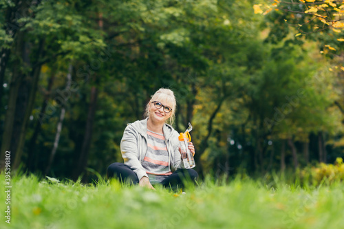 Beautiful senior woman on a walk in the park, performs exercises sitting on the grass, morning in the park