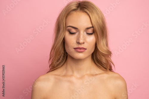 Beautiful sensual topless woman with long blonde hair posing isolated over pink background. Beauty concept
