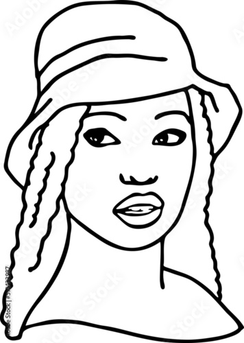Beautiful sexy black African lady wear sun hat. Attractive woman dress had clothes for happy holiday. Cartoon character face portrait. Hand drawn vintage vector illustration. Old style comic drawing.