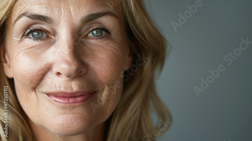 Beautiful smiling elderly woman, porter close-up on a gray background. Beautiful old age, golden years. A concept for a beauty salon, clinic.