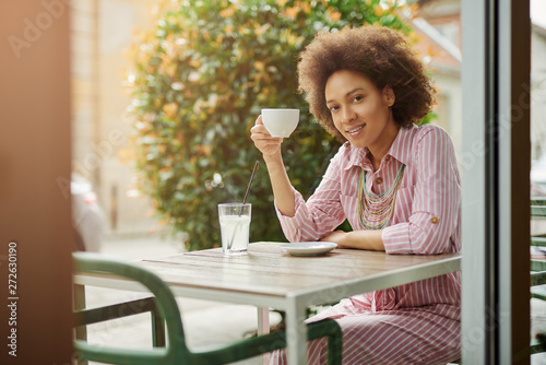 Beautiful smiling mixed race woman in pink striped dress sitting in cafe and enjoyingh her coffee.