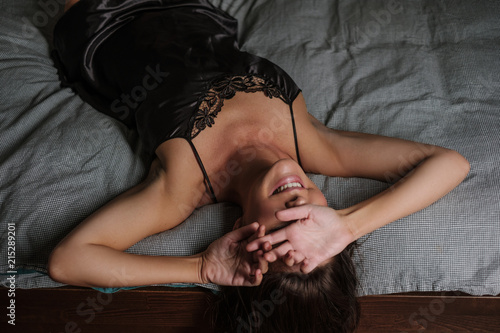 sex, bed, satisfaction, nightdress, nightdress, nightdress, lie, intimate, happy, hand, cover, closeup, brunette, black, bedchamber, beautiful, alone, woman, upside down, smiling, smile, silk, shy, sexy, sensual, seductive, caucasian, white, female, lady, person, people, adult, adult, 30s, grown-up