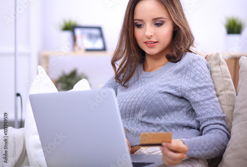 Beautiful smiling woman with laptop and a credit card