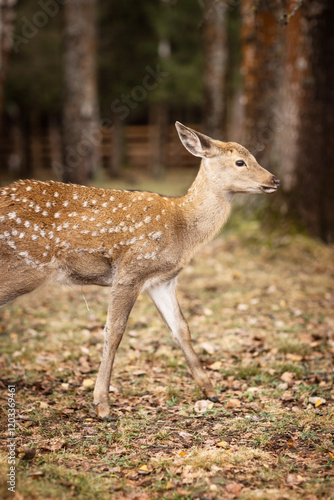 beautiful spotted deer on an autumn day in nature among hay