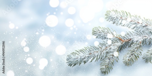 beautiful spruce branch on blue background with white lights bokeh. copy space