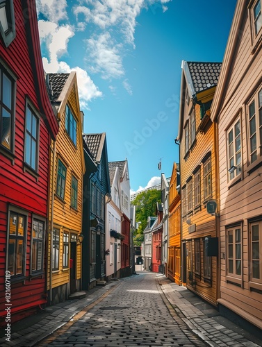 Beautiful street view of wooden houses in Norway