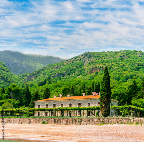landscape, summer, beach, green, mountain, beautiful, sand, gold, bay, sea, shore, palace, architecture, building, hotel, garden, resort, luxury, relax, vacation, holiday, italy, montenegro, coastline, highland, sky, background, season, travel, tour, journey, touristic, travelling, nature, adriatic, landmark, lagoon, europa, history, coast, destination, ancient