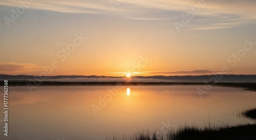 Beautiful sunrise illuminating the calm waters of a lake, reflecting soft colors in morning glow