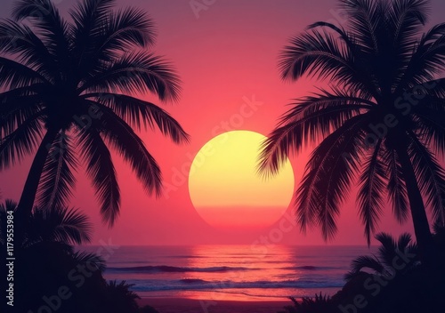 Beautiful sunset over the ocean with palm trees framing the view on a serene evening