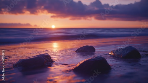 Beautiful sunset over the ocean, with smooth waves and rocks along the shore. A peaceful scene that invites relaxation and reflection.