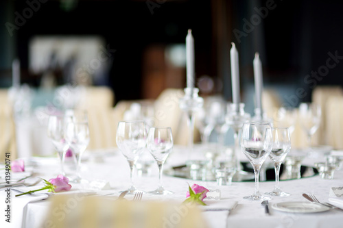 Beautiful table setting with crockery and flowers for a party, wedding reception or other festive event