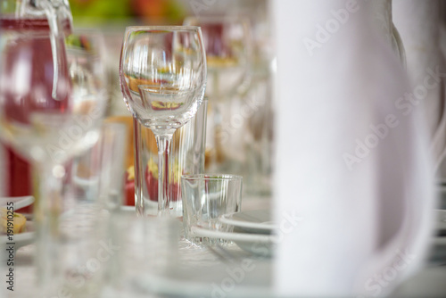 Beautiful table setting with crockery and flowers for a party, wedding reception or other festive event. Glassware and cutlery for catered event dinner